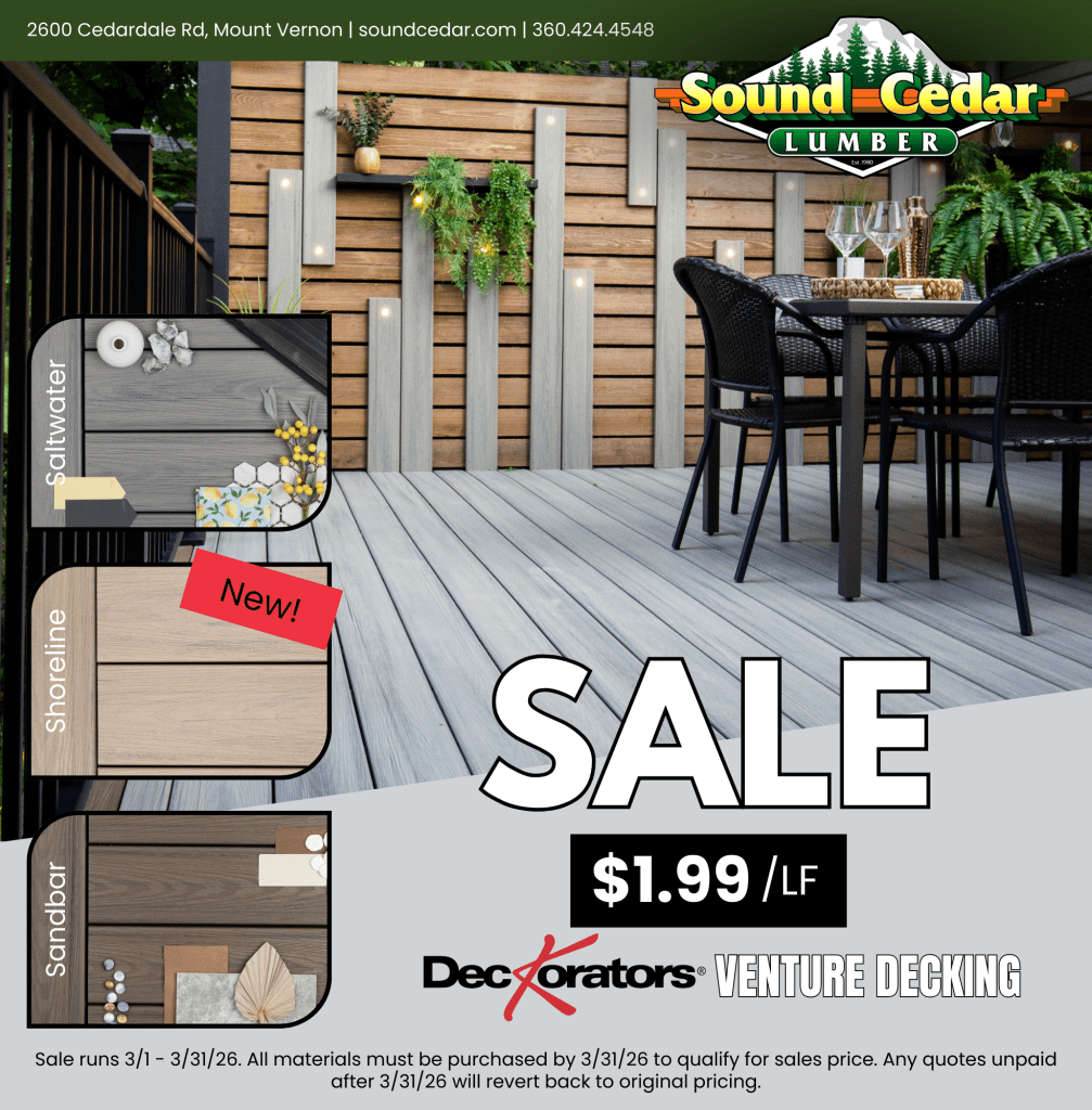 As a proud member of the Skagit Valley since 1980, the focus of Sound Cedar Lumber is working with customers to create lasting relationships in business and the community. Though we specialize in Western Red Cedar you’ll find we carry more materials than other lumberyards in Skagit County. Our 8,000 sq ft showroom and 14,000 sq ft warehouse also holds everything from Doug Fir and Japanese Cedar to Pressure Treated Hem-Fir and more! Our convenient location just off of I-5 in Mount Vernon makes it easy to stop by whether you’re coming from Burlington, Bellingham, Everett, Seattle – or just about anywhere in Skagit, Snohomish, Whatcom, Island and King Counties.